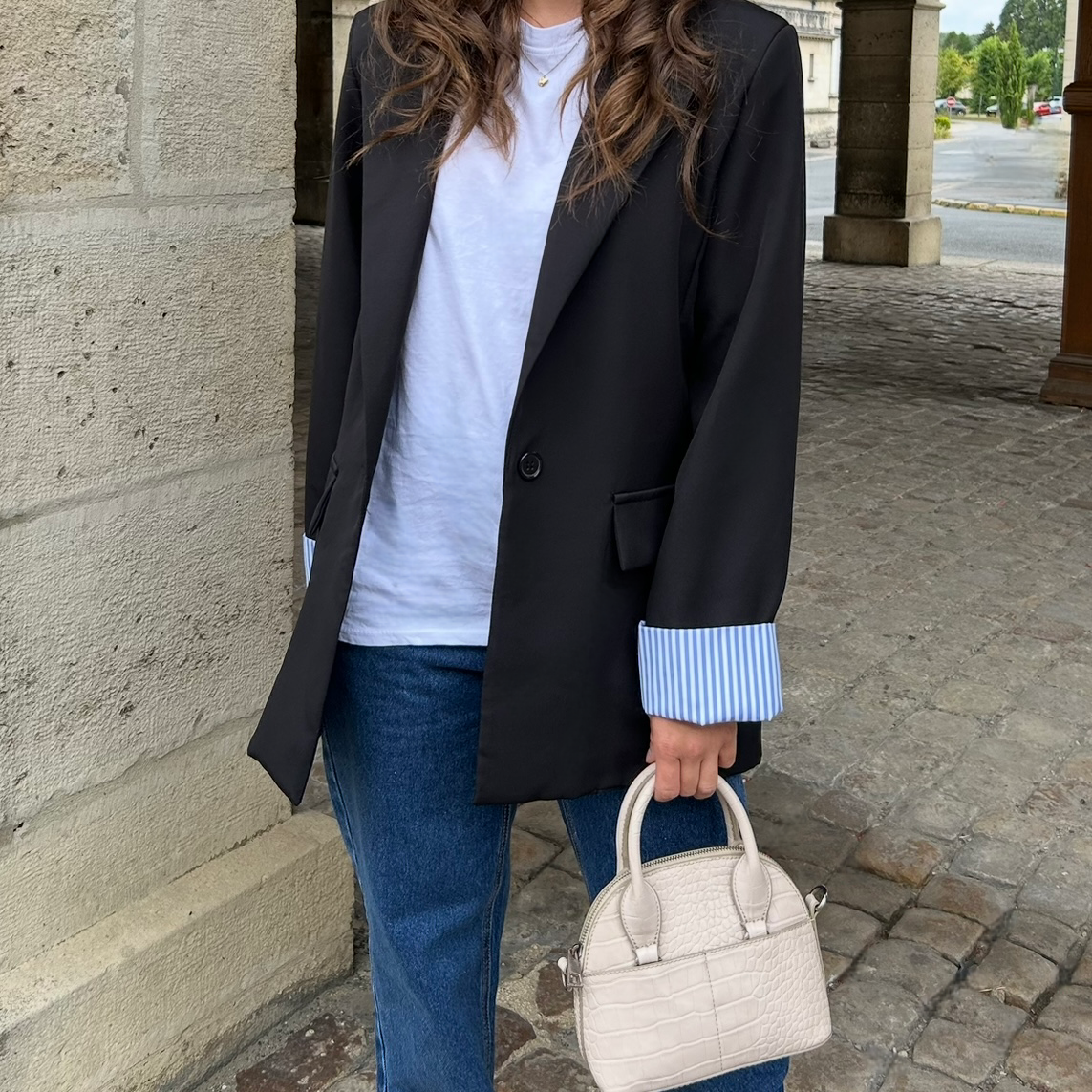 Chic et structuré, le Blazer Zayneb revisite un intemporel du dressing avec une touche d’originalité qui fait la différence. Son coloris noir profond en fait une base élégante, idéale en toute saison, tandis que ses manchettes rayées bleu et blanc apportent une note graphique, moderne et inattendue.