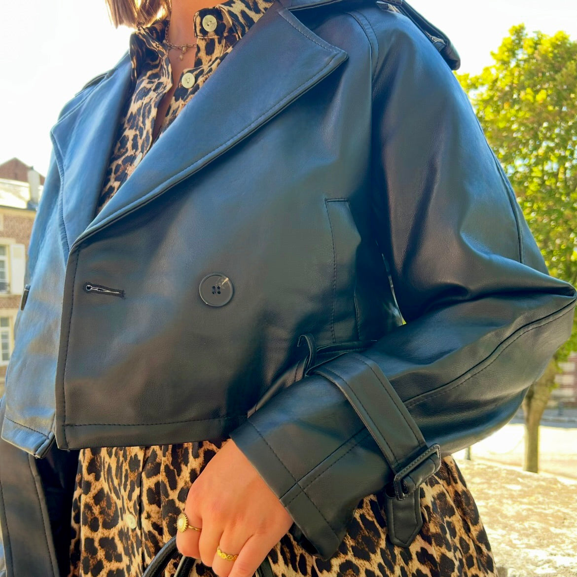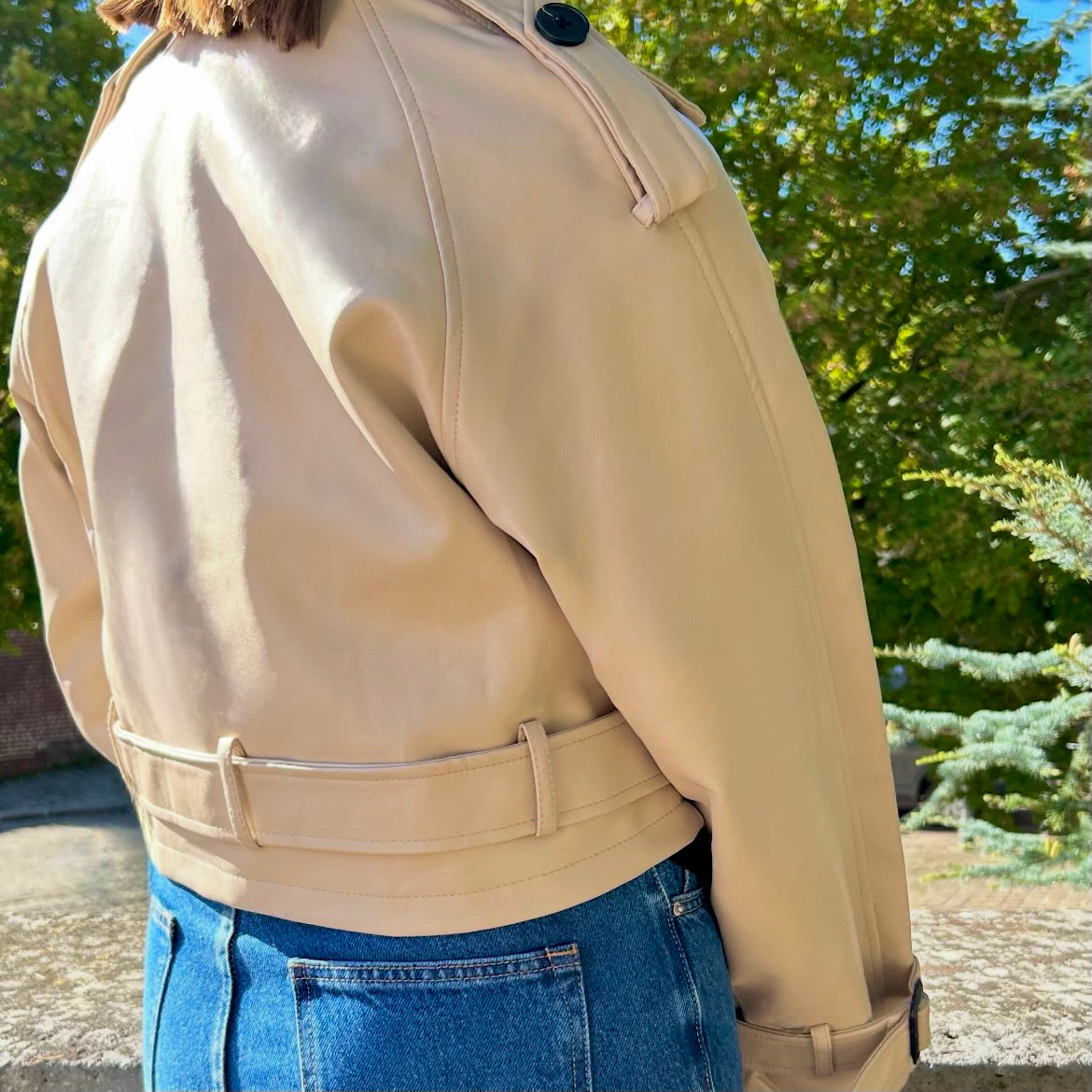 Sa ceinture intégrée qui permet de marquer la taille et structurer la silhouette, tout en apportant une touche féminine au style trench. Le côté court du vêtement casse le côté classique du trench basique.